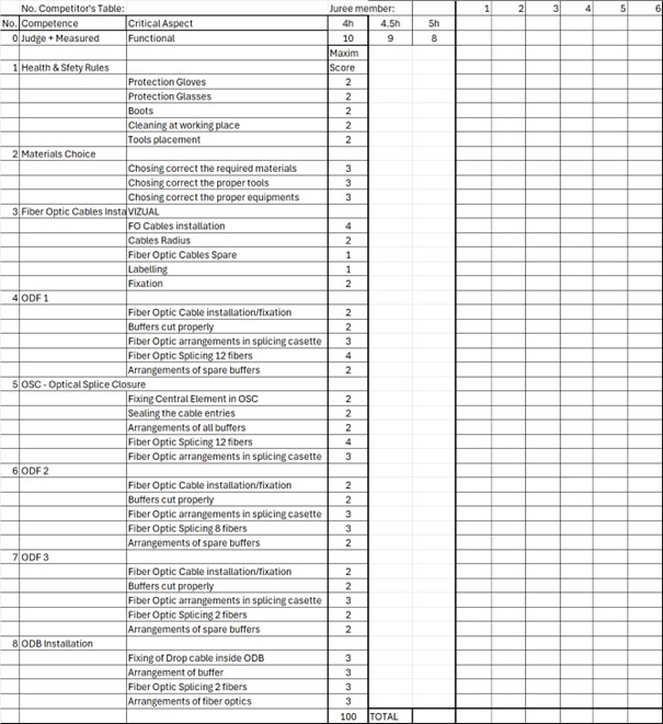 Při montáži bylo nutné dodržovat pořadí vláken v kabelu a spojovat vlákna dle vláknového plánu. Obdobně tak bylo nutné dodržovat barvy sekundární ochrany 900 μm pigtailů SC/APC dle jejich pořadí na panelu rozvaděče ODF. Nedodržení dokumentace bylo penalizováno při závěrečném hodnocení kvality montáže.