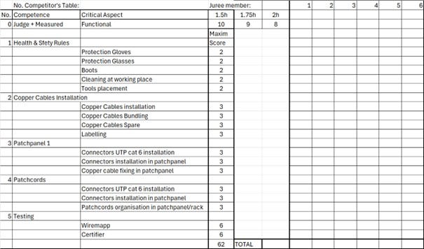 Před startem proběhl brífing k zapojení trasy. Úkolem každého soutěžícího bylo v časovém limitu 1,5 hod smontovat metalickou kabeláž, celkem 6 úseků, zakončených na jednom patchpanelu dle předepsaného zapojení. K tomu si vyrobit propojovací šňůry.