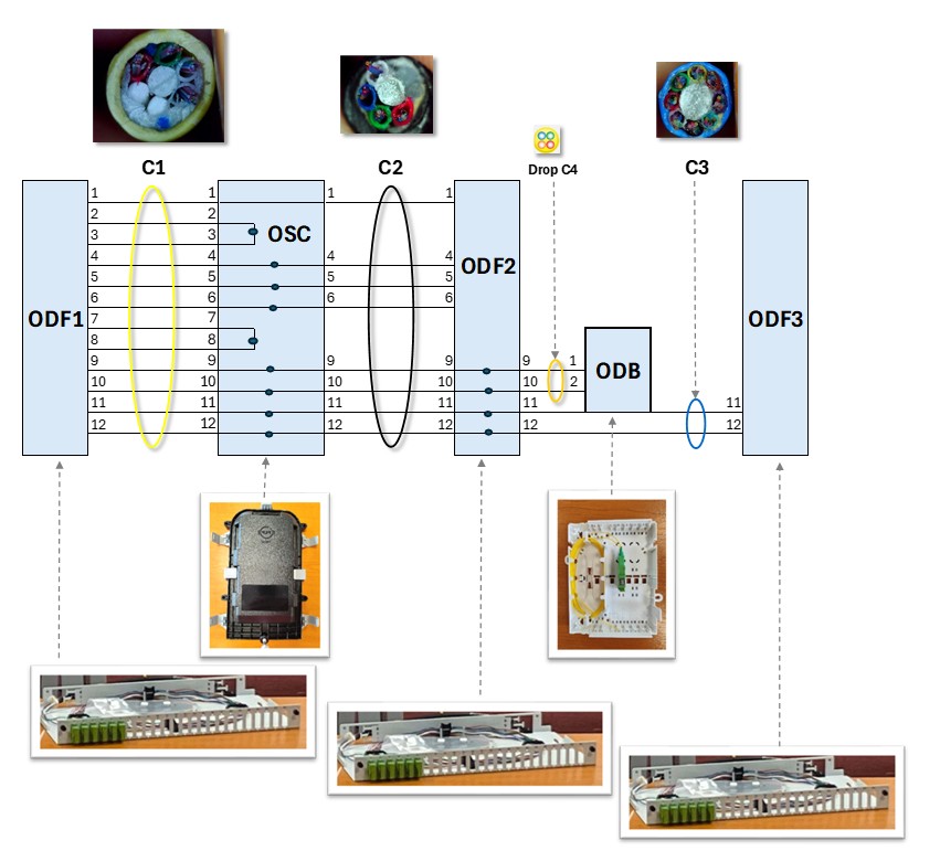 Jednotlivé úseky vláknem byly vzájemně propojeny svařováním. Stejně jako pigtaily s SC/APC konektory byly přivařeny na vlákna zakončená v koncových rozvaděčích a boxech. Nevyužitá vlákna v profilu kabelu zůstala nezakončena.