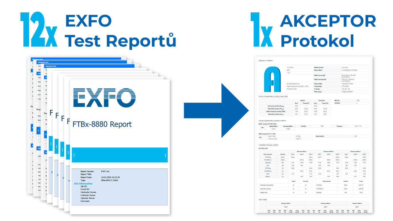 - Zdrojové náměry EXFO Test Reports nahrajte do webové aplikace AKCEPTOR.